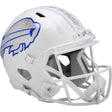 Buffalo Bills Full Size Speed Replica NFL Helmet by Riddell. This full size Bills helmet is designed with a non-wear plate and molded foam jaw pads. a steel polyvinyl-coated face mask, 4-pt chin strap, and elliptical air vents. NFL Team name on back bumper (except Chiefs, Steelers and Giants). The officially licensed NFL helmet is great for autographs and features Bills team logo decals on both sides. The striking shape of the future. NFL Bills Replica Speed helmet size medium measures: 12.75"(L), 9.25"(W), 9.75"(H). NFL Buffalo Bills Full Size Speed Replica Helmet. (NOT FOR WEARING)
