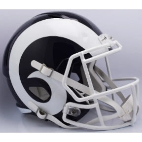 Los Angeles Rams Full Size Speed Replica NFL Helmet by Riddell. This full size Rams helmet is designed with a non-wear plate and molded foam jaw pads. a steel polyvinyl-coated face mask, 4-pt chin strap, and elliptical air vents. NFL Team name on back bumper (except Chiefs, Steelers and Giants). The officially licensed NFL helmet is great for autographs and features Rams team logo decals on both sides. The striking shape of the future. NFL Rams Replica Speed helmet size medium measures: 12.75"(L), 9.25"(W), 9.75"(H). NFL St Louis Rams Full Size Speed Replica Helmet. (NOT FOR WEARING)