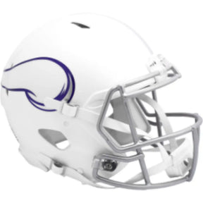 Minnesota Vikings Full Size Authentic Revolution Speed NFL Helmet by Riddell. This full size Vikings helmet is designed with extended mandible (jaw area) protection, a steel polyvinyl-coated face mask, chin strap, increased padding, an integrated facemask attachment system and elliptical air vents. NFL Team name on back bumper (except Chiefs, Steelers and Giants). The officially licensed Minnesota Vikings helmet is great for autographs and features Vikings team logo decals on both sides. The striking shape of the future. NFL Vikings Authentic Revolution Speed helmet size is 13.5"(L) x 9.75"(W) x 10.25"(H). NFL Minnesota Vikings Full Size Helmet.