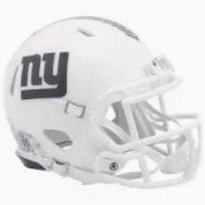 New York Giants Mini Speed Football Helmet. The ultimate NFL mini speed football helmet collectible, perfect NFL mini speed football helmets for autographs and collectors. Mini Speed Football Helmet with great graphics. Official NFL Mini Speed Football Helmet with official NFL team decal. ABS plastic Mini Speed Football Helmet shells with plastic facemask. Realistic interior foam padding, vinyl-leather chin strap. This is an affordable NFL football helmet for the true fan. Size: 1/2 scale versions of NFL football helmets. Size: 6"(L), 4½"(W), 5"(H) - (NOT FOR WEARING).