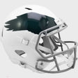 Philadelphia Eagles Full Size Speed Replica NFL Helmet by Riddell. This full size Eagles helmet is designed with a non-wear plate and molded foam jaw pads. a steel polyvinyl-coated face mask, 4-pt chin strap, and elliptical air vents. NFL Team name on back bumper (except Chiefs, Steelers and Giants). The officially licensed NFL helmet is great for autographs and features Eagles team logo decals on both sides. The striking shape of the future. NFL Eagles Replica Speed helmet size medium measures: 12.75"(L), 9.25"(W), 9.75"(H). NFL Philadelphia Eagles Full Size Speed Replica Helmet. (NOT FOR WEARING)