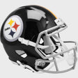 Pittsburgh Steelers Full Size Speed Replica NFL Helmet by Riddell. This full size Steelers helmet is designed with a non-wear plate and molded foam jaw pads. a steel polyvinyl-coated face mask, 4-pt chin strap, and elliptical air vents. NFL Team name on back bumper (except Chiefs, Steelers and Giants). The officially licensed NFL helmet is great for autographs and features Steelers team logo decals on both sides. The striking shape of the future. NFL Steelers Replica Speed helmet size medium measures: 12.75"(L), 9.25"(W), 9.75"(H). NFL Pittsburgh Steelers Full Size Speed Replica Helmet. (NOT FOR WEARING)