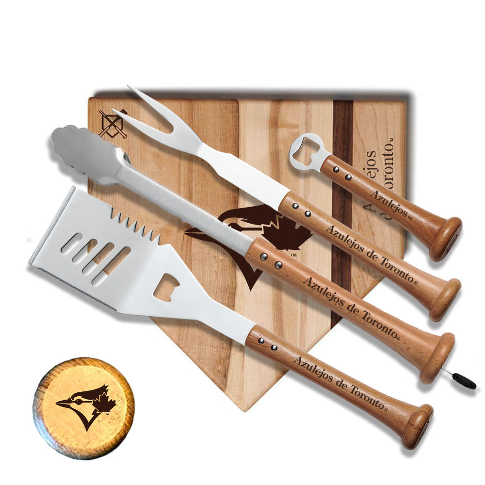 The Grand Slam Set set combines our most popular baseball tools & boards in a special bundle. When you buy a Grand Slam Set, you'll save on the combination of the Slider Spatula, Forkball Fork, Splitfinger Tongs, Pickoff Bottle Opener, and Home Plate cutting board. Giving as a gift or adding your own style? Add a personal touch and customize your Baseball BBQ Grand Slam Tool Set with laser-engraved text on the patented baseball bat handle design to hit it out of the park.